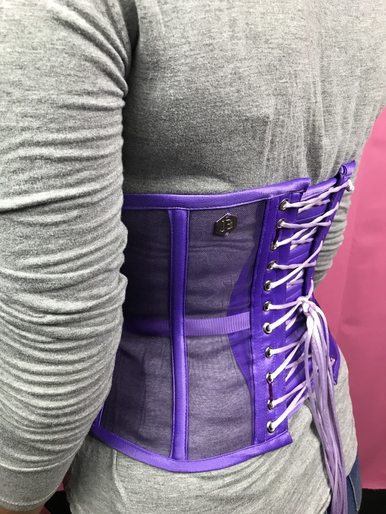 Corset underbust em tela e acabamento em crepe, estruturado com barbatanas em aço inoxidável. A amarração traseira é ajustável por meio de ilhós e cordão acetinado.