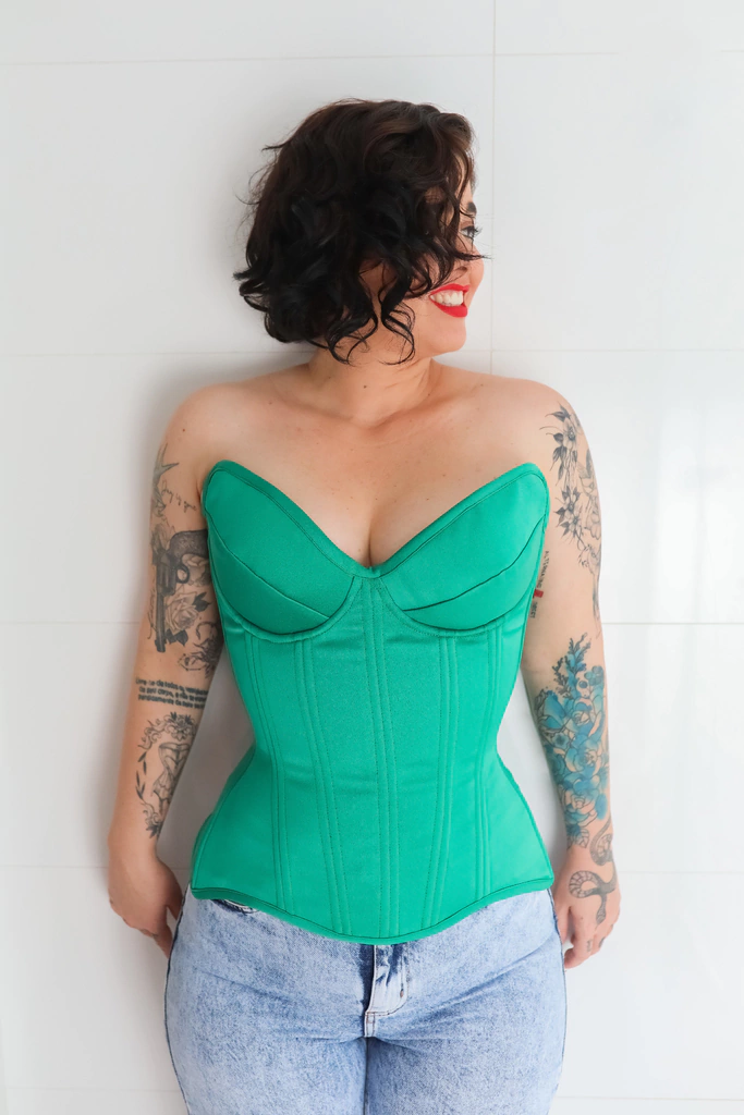 Corset inspirado na personagem Docinho de As Meninas Super Poderosas. Modelo overbust com bojo em crepe, estruturado com barbatanas em aço inoxidável. A amarração traseira é ajustável por meio de ilhós e cordão acetinado.
