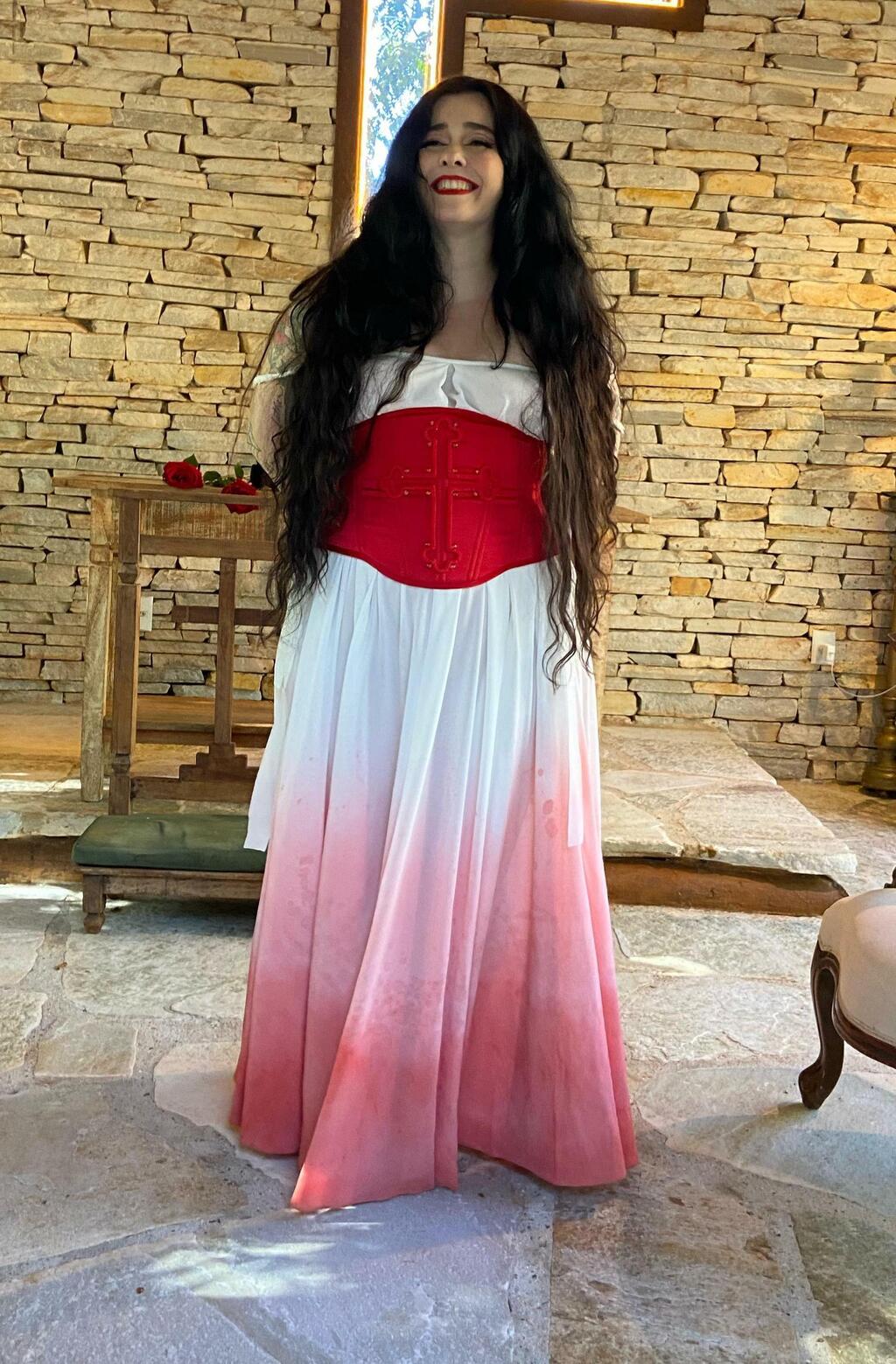 O CORSET SANGUINIS é uma obra única! O modelo underbust é confeccionado em crepe vermelho com bordado central feito á mão, possui estruturação interna com barbatanas de aço inóx e amarração regulável por meio de ilhós e cordão acetinado.
